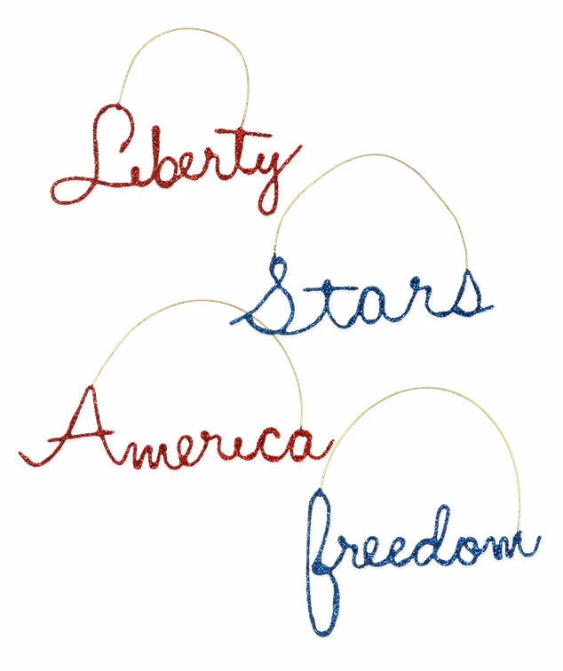 Show your patriotism with these red and blue glittered cursive word ornaments.