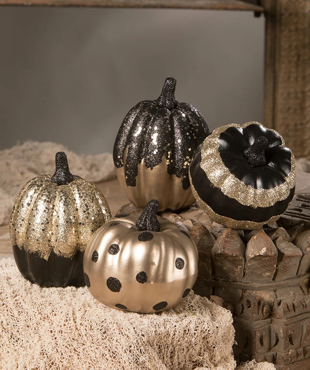 Dress up your Halloween decor with this smashing black and gold decorated pumpkins.