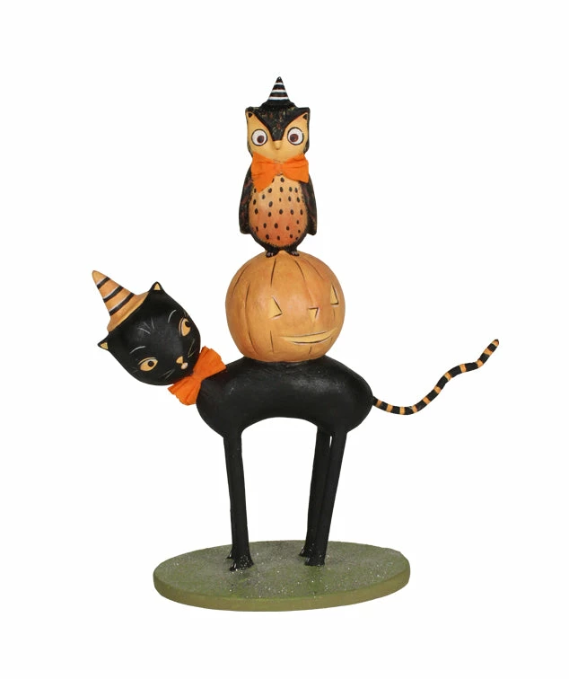 Grinning ghouls and goblins will appear at the sight of this amusing Kitten Around cat, pumpkin and owl stack.