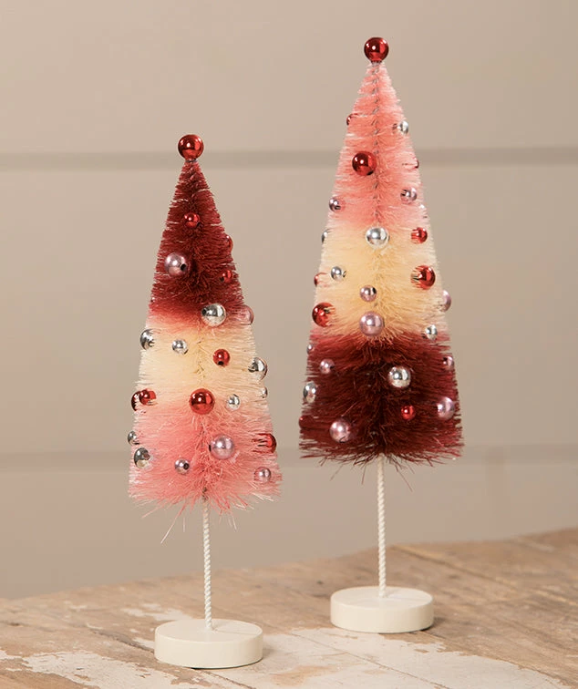 Create a cute valentine scene with these pink, deep red, and cream bottle brush trees with silver and red beads.