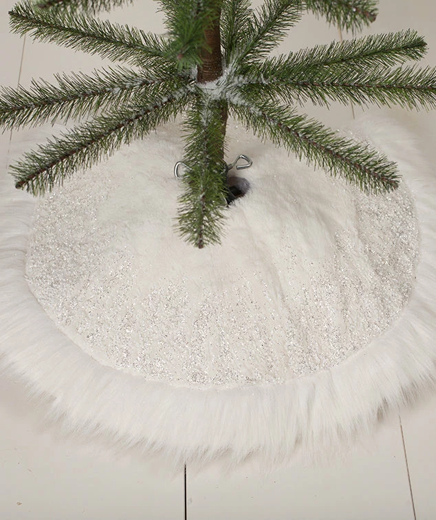 Dream up a winter wonderland with this small faux fur, glitter and bead Winter Snowflake Tree Skirt