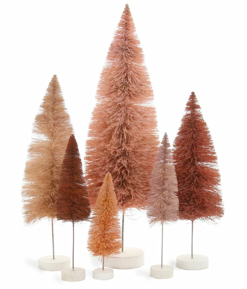 Create a stylish holiday vignette with these textural shades of Rose Bottle Brush trees that come in various sizes.
