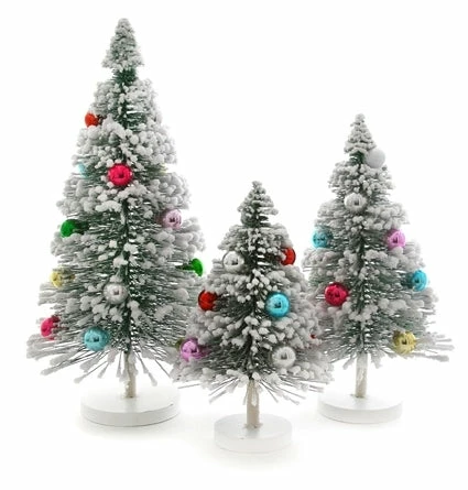 These Snowy Flocked Bottle Brush Trees decorated with multi color balls will have you feeling festive in no time.