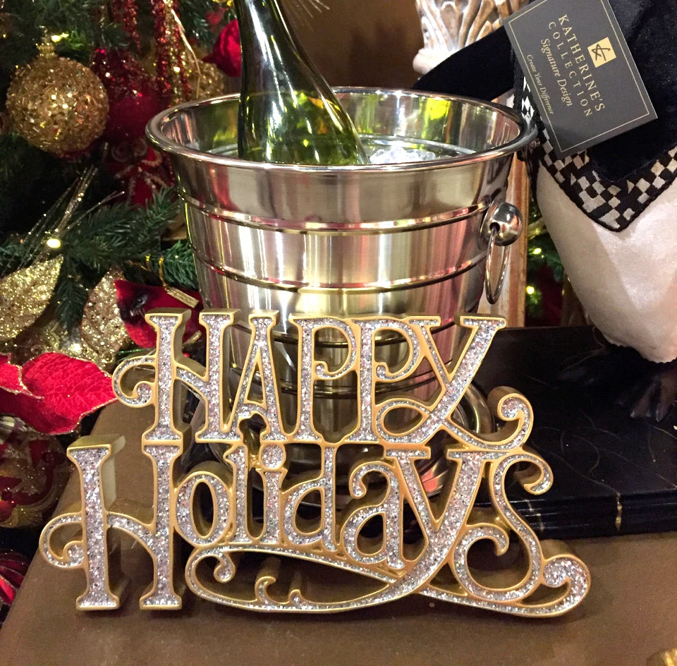 Make the holidays sparkle with this gold and silver glittered Happy Holidays Tabletop Sign.