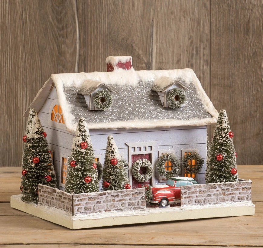 Wow this family is ready for the holidays! Make an enchanted winter scene with this decked out Retro White Cape Code House with vintage style car parked outside. Let’s take a holiday drive.