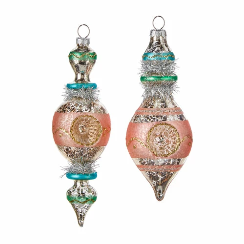 - Vintage-inspired mercury glass ornaments with tinsel and glitter accents
